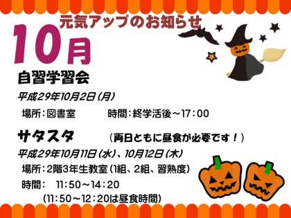 10月11日(水)と10月12日(木)は2階3年生の教室で行う予定です。時間は11時50分〜14時20分です。11日と12日の学習会に参加される生徒は昼食を持ってきてください。