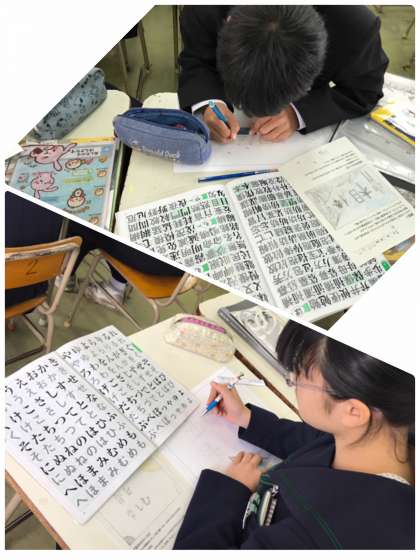 教科書資料にある模範を見ながら、点描・はね・はらい等に注意しながら書いています。