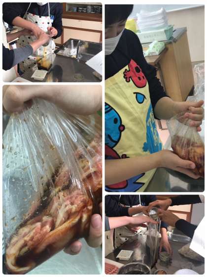 まず、豚肉薄切りに味付けをします。つけ汁をビニール袋であわせ、豚肉をもみこみます。