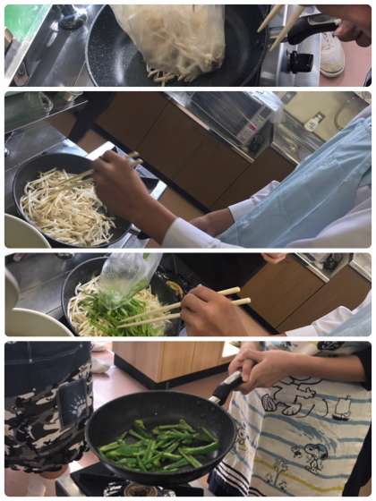 前日に有志が下ごしらえをして、調理実習で「しょうが焼き」と「みそ汁」を作っています。