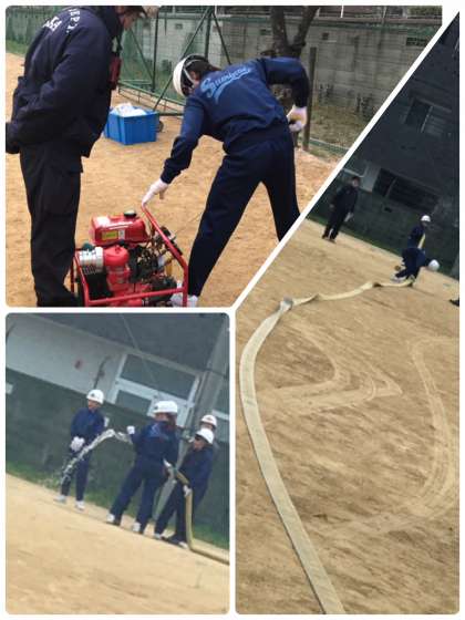 長いホースを3つ連結させて、防火水槽などからくみ上げた水を放水しました。