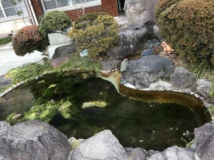 玄関前の池面が凍っていたり、霜のおりたグラウンドの一部が凍結していたりします。