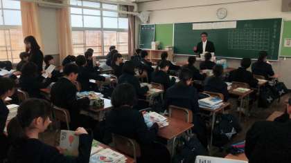 中学校で使う教科書を受け取り、担任の先生からお話を聞いています。