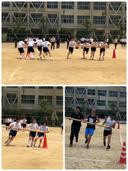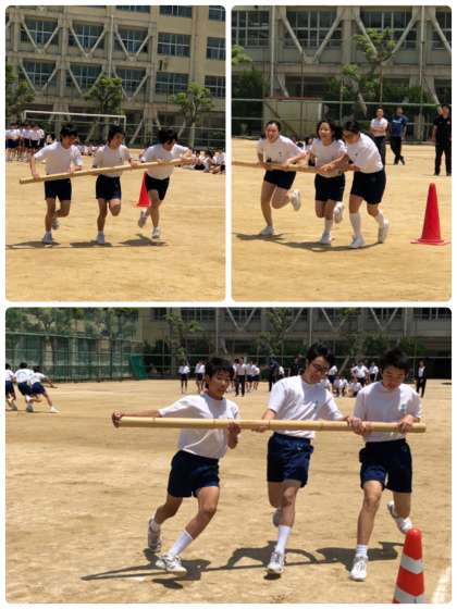 「台風の目」は、3・4人が1本の棒につかまり、2か所のコーンを回って競う競技です。内外の並び順や棒の持ち方など、もっと早く走る方法はないかと模索しています。