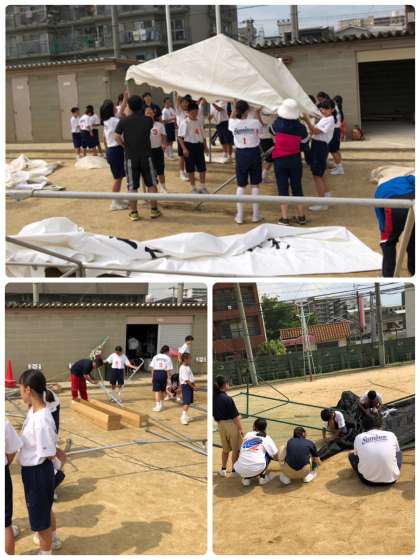 本部、準備用テントをみんなで組み立てて貼っています。