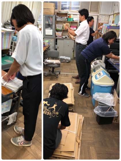 ダンボールや再生紙などを、先生たちが片づけをしています。