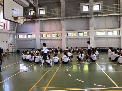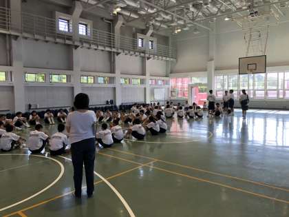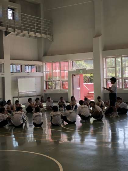 体育館に集合して、クラスごとにふりかえりを行なっています。