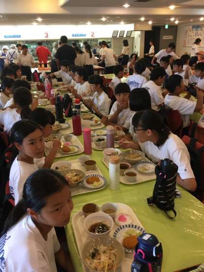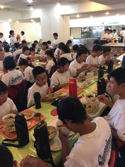 昼食は、親子丼、コロッケ、冷やしうどんとボリュームたっぷりです。