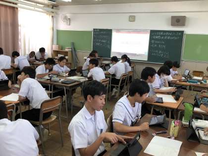 生徒たちにとって、ICT機器がとても身近な人もそうでない人も、班で学ぶことによって補っています。