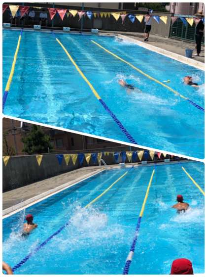 1年生は、5・6限目に水泳大会を行います。水泳が得意の生徒もそうでない生徒も、みんなが活躍できるように種目が考えられています。