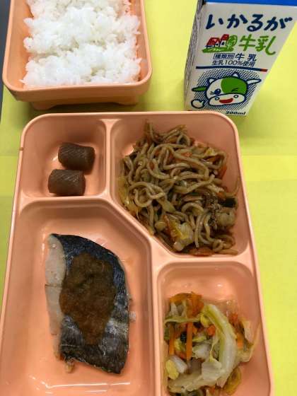 さごしのおろし醤油かけ、焼きそば、白菜の甘酢あえ、こんにゃくの甘辛煮、米飯、牛乳