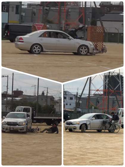 自転車のさまざまな悪い乗り方や自動車との接触など、迫力ある事故を演じていただきました。