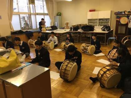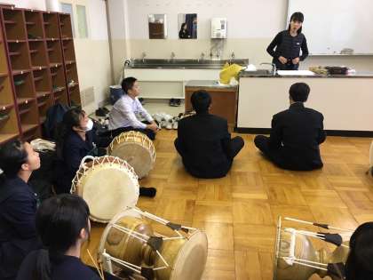 住吉中学校・真住中学校の3校で10名の生徒たちが、民族楽器チャンゴやプクの練習をしています。だんだんみんなの音が揃うと、迫力がでてきました。