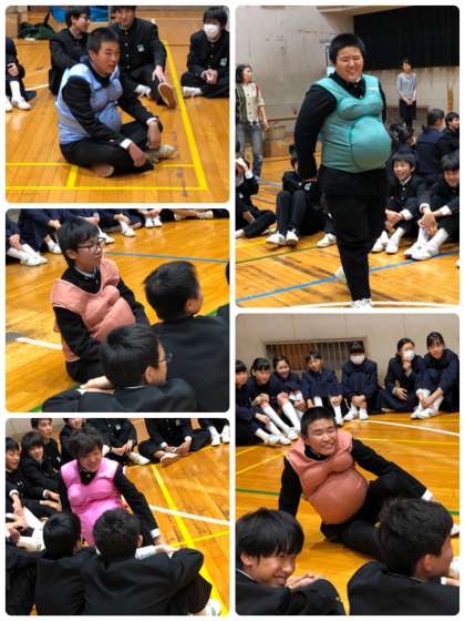 男子生徒が妊婦体験をしています。「動きにくいです」「かがむのがしんどいです」など実感できたようです。