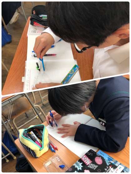 1年生の数学の授業では、コンパスを使って垂線を書いています。