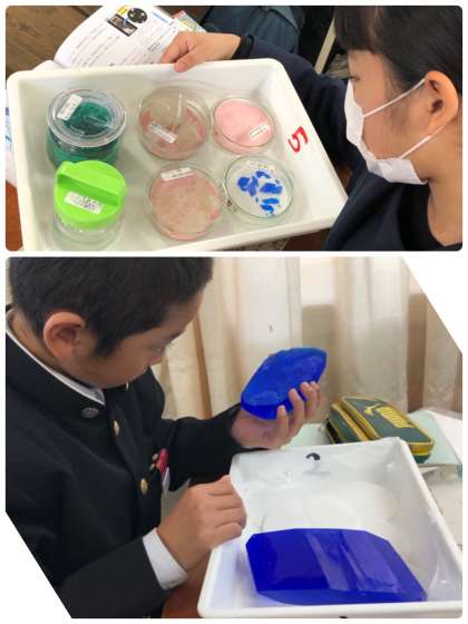 澄んだブルーがとても鮮やかな硫酸銅を観察しています。