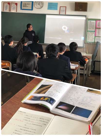 3年生の理科の授業では、教材ソフト「Mitaka」を活用して天体の単元を学習しています。また、先生がタブレット端末に書き込んだものを提示して授業を進めています。