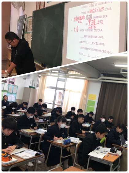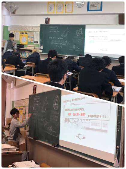 3年生の数学の授業では、先生が作成した教材を提示して進めています。