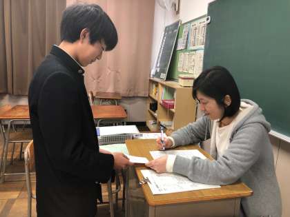 受験票を受け取り、当日の注意事項を確認しています。