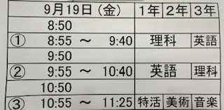 本日は全学年理科、英語と3年生は音楽、2年生は美術のテストです。