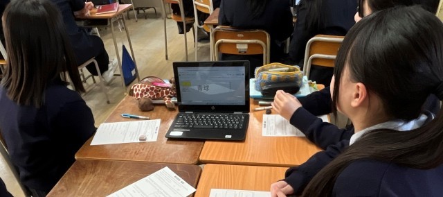 2年3組は数学。班ごとにパソコンを開き、確率を通して、利益を生む方法を考えました。班一人ひとりの意見をまとめ、スライドに打ち込みます。