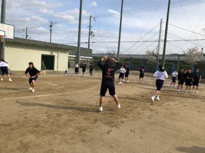 先輩の動きを見ながら一年生も一緒にフットワークをしています。