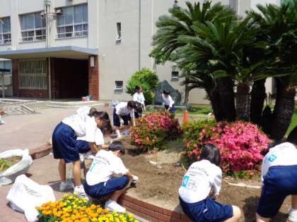 中間テストも終わり、今日は放課後に緑化委員会のみなさんで「ふれあい緑化活動」を行いました。新北島中学校の代名詞でもある、美しい玄関をまた今年も彩も新たに見ることができそうです。今日は少し暑さも増してきて大変でしたが、1年生から3年生まで心を込めてがんばりました。