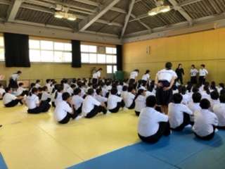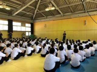 1年の学年集会で一泊移住のしおりの表紙や挿絵に選ばれた生徒の紹介がありました。