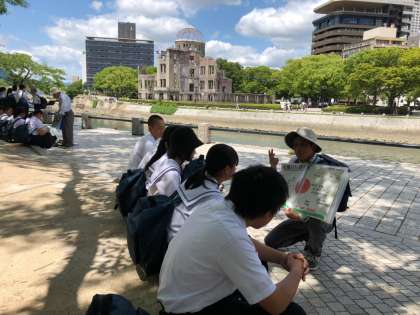 *碑巡りの様子です。24ある生活班につき、お一人のボランティアガイドの方に付き添っていただき、様々なお話を伺います。