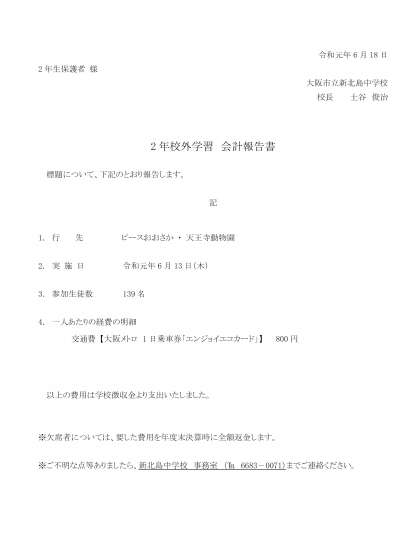 6月13日(木)に実施した校外学習の費用については、以下のとおりとなりますのでご確認ください。