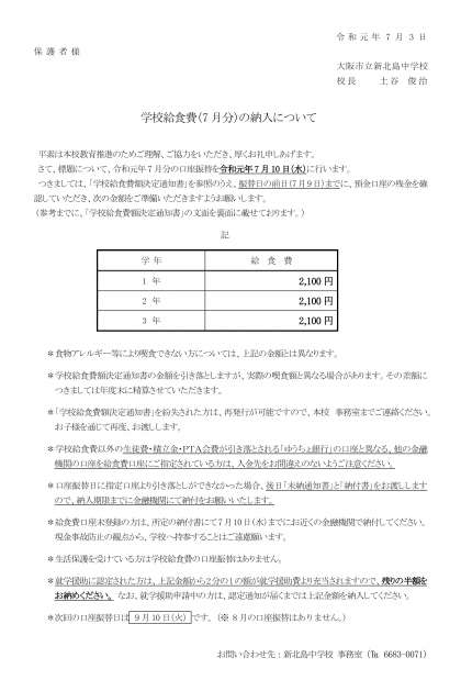 また、給食費口座未登録の方は、所定の納付書にて7月10日(水)までにお近くの金融機関で納付してください。