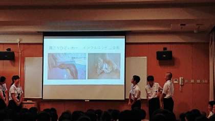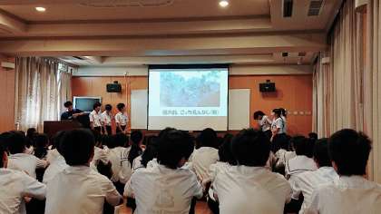 6限、多目的室にて6月に行った校外学習の班別活動の発表と、先日見学させていただいた、G20会場見学の作文を代表生徒の8名が発表してくれました。