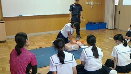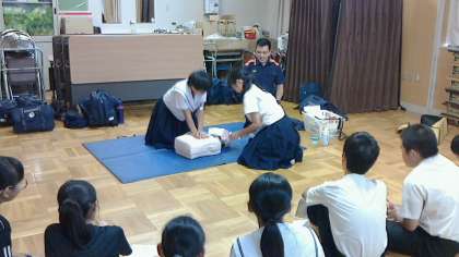 ただ今、多目的室で「救急救命講習会」を行っています。さまざまな部活動から代表の生徒に参加してもらい、AEDの使い方や胸部圧迫法(いわゆる心臓マッサージ)について消防署員の方から教わっています。各学年、各部活動の中に救命技術のある人がいると安心です。習っている皆さんも真剣な目つきで参加しています。