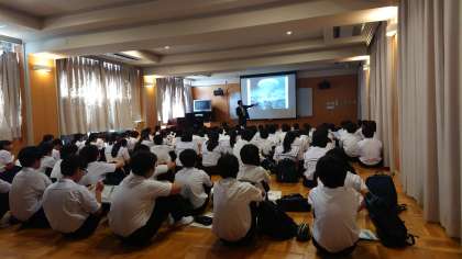二年生の平和学習では、朝日新聞社の外園先生を招いて、講演をしていただきました。