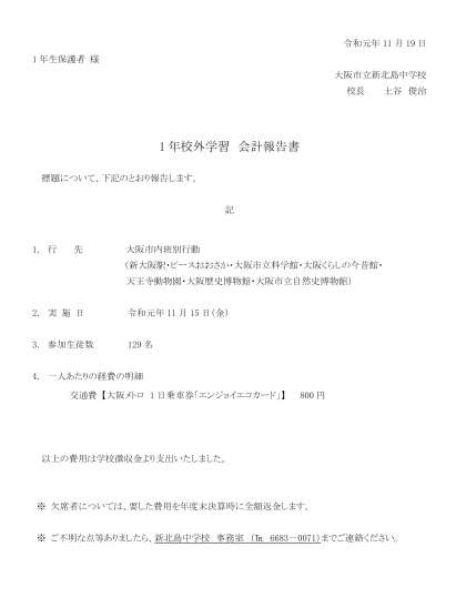 1年校外学習の会計報告について