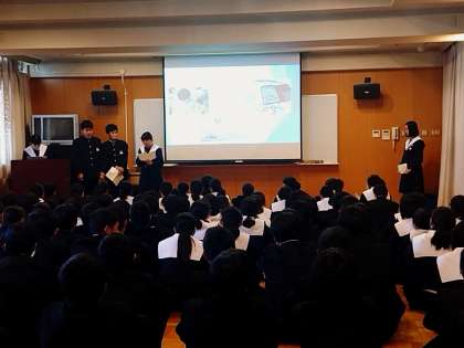 二年生は、4限に多目的室で先日の高校出前授業の学習体験内容の発表会を行いました。