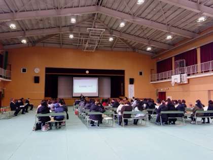 公開授業のあと、体育館で来年度の新入生保護者説明会が行われました。