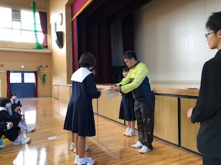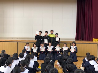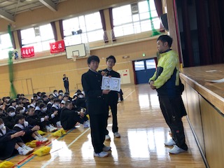 学年集会で百人一首大会の表彰がありました。