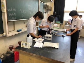 2年生の理科(炭酸水素ナトリウムの加熱実験)の様子と、数学の授業の様子です。