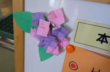 職員室前には、配膳員さんが折り紙で作ってくださった「紫陽花」があります。