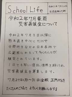 明日7月27日(月)から31日(金)まで朝の登校時間中に生徒会執行部が義援金箱を持ち、正門付近に立っていますので、たくさんのご協力、よろしくお願いします。