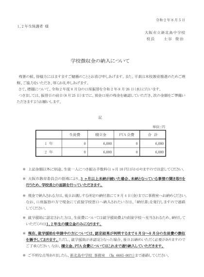 なお、現金で納入される方は、始業式以降にお渡しする所定の納付書にて9月4日(金)までに学校事務室へお納めください。