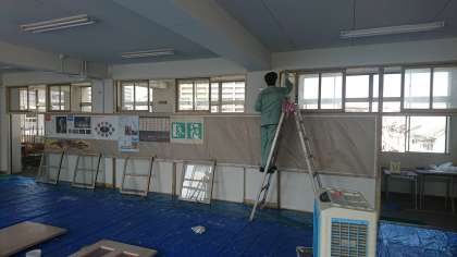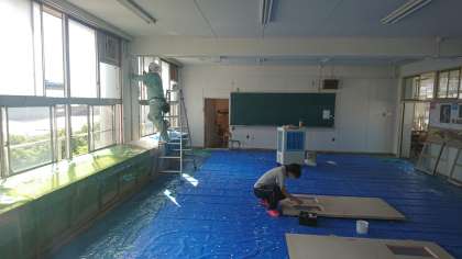 酷暑でクーラーもない環境の中、大変な作業ですが、熱中症予防対策を行いつつ、新学期に登校してきた皆さんのビックリした顔と笑顔を目に浮かべながら、強力な助っ人ともに協力して作業に取り組んでいます。