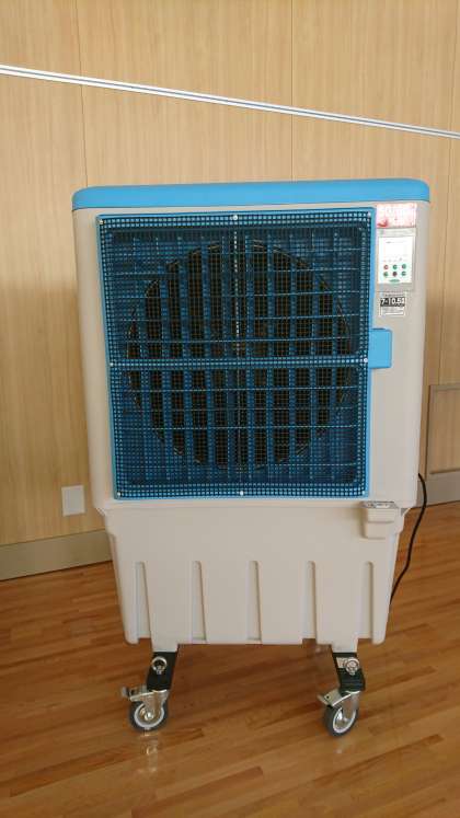 気化熱の原理を利用した、冷風が出る業務用の大型扇風機です。