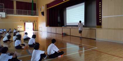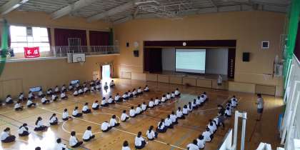 暑い中でしたが、体育館に集まって、これまでの戦争学習について、一年生たちが書いた感想のまとめをしました。