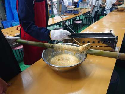 上手に作る最大のコツは、竹の棒につけた余分な生地をしっかりと落とすことだそうです。