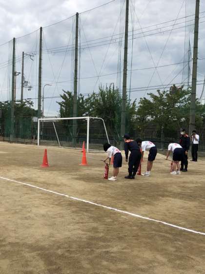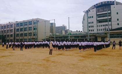 本校一階の第一理科室から出火したという想定で、全校でグラウンドに避難しました。