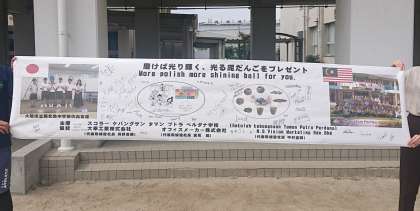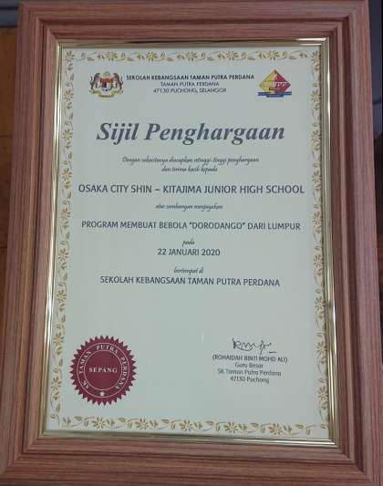 3年生が昨年9月に行った職業体験で、株式会社大幸工業株式会社様のご指導で作った泥だんごが、マレーシアの学校教材に用いられ、現地から賞状と生徒たちからの感謝のメッセージが届けられました。