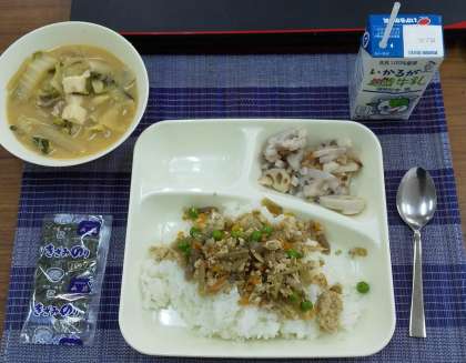 鶏ごぼう飯(鶏ひき肉、しょうが、つきこんにゃく、ごぼう、にんじん、グリンピース)