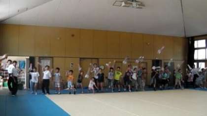 平林小学校と新北島小学校3・4年生の希望者が、中学校科学部員に教わりながら、傘袋ロケット作成し飛ばしました。12m超える飛距離の出たものもありました。
